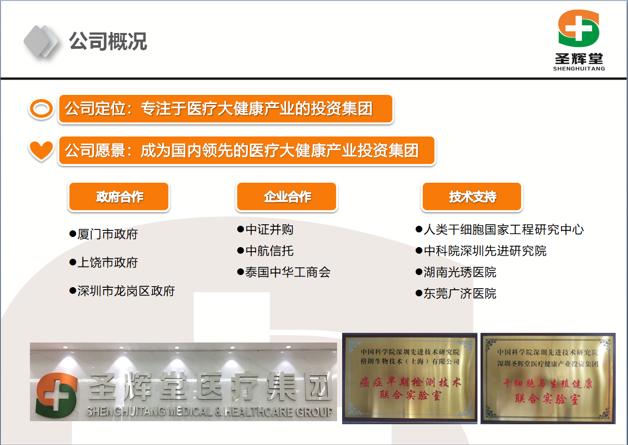 目前圣輝堂醫療集團已與廣東、江西等多地政府、金融機構簽訂戰略合作協議、已與多家上市公司展開實質性合作,進行大健康產業資源整合和資本運作,逐步建立圣輝堂大健康投資生態體系;并在上海、廣東(廣州、深圳、東莞)、福建、江西、貴州等地布局干細胞、輔助生殖、精準醫療、癌癥早篩診斷試劑和健康管理等多個項目;開始著手與美國、泰國等國家的知名醫療機構開展合作,搭建國際先進醫療資源的共享平臺。